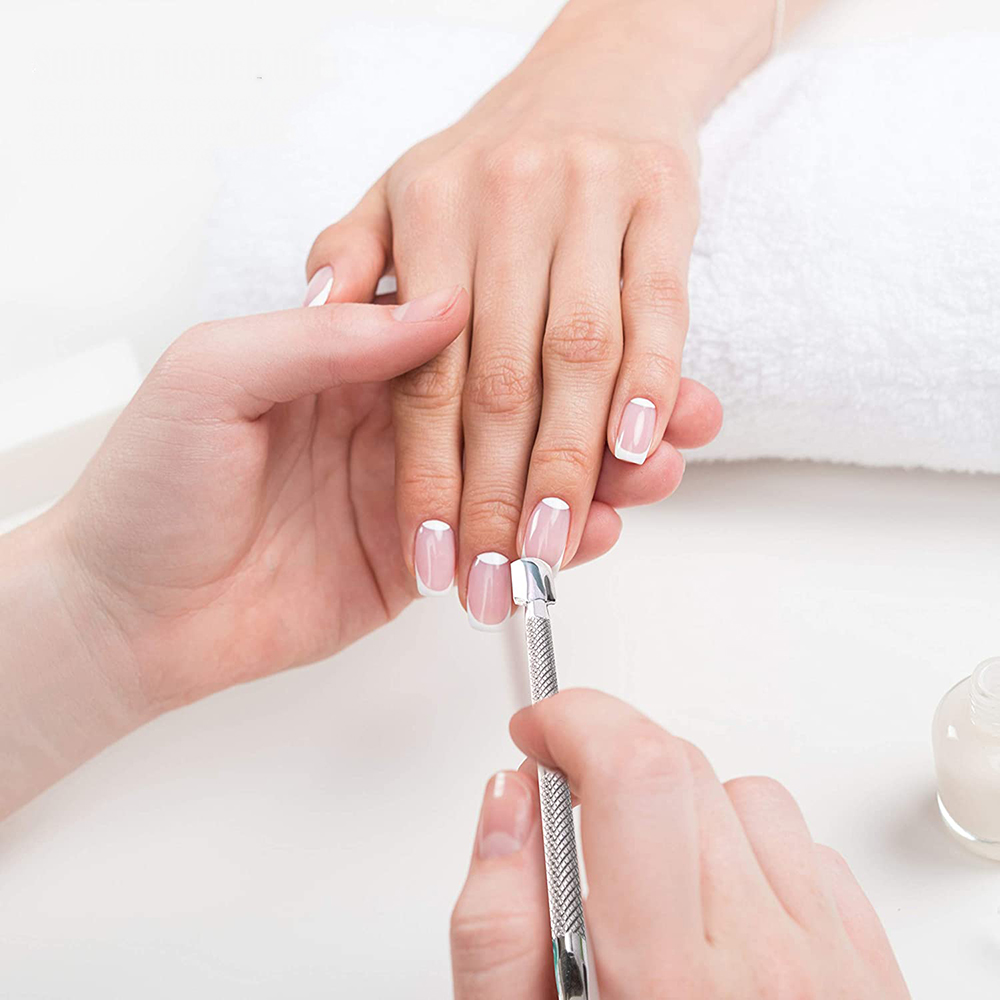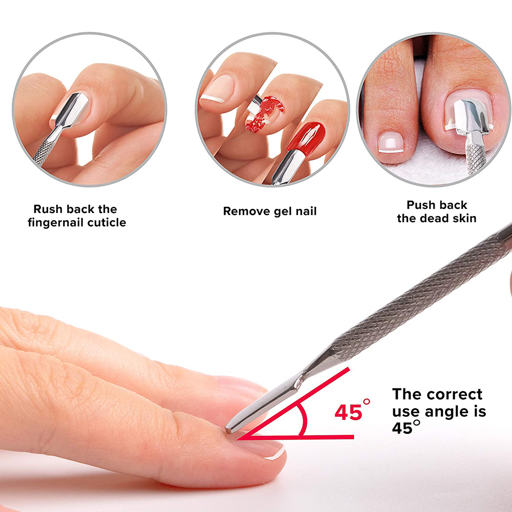Gently pushes back and shapes nail cuticles